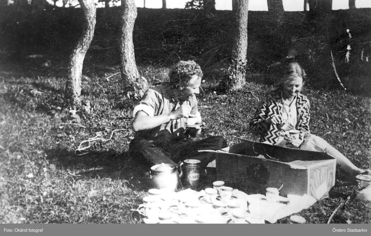 Kaffepaus i skogsglänta i Yxtabacken i Hovsta, 1920-tal