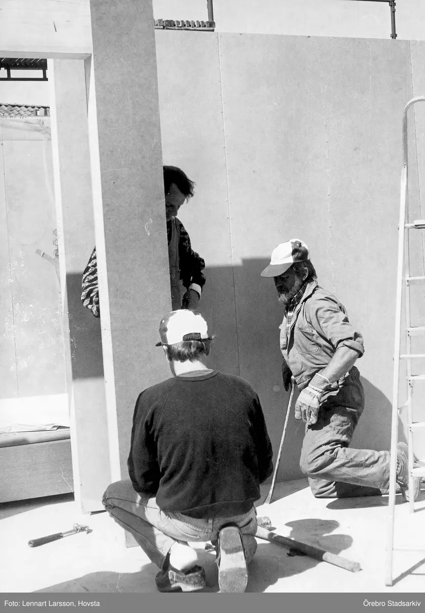 Byggherren och två snickare i nygygge i Förlunda i Hovsta, 1986
