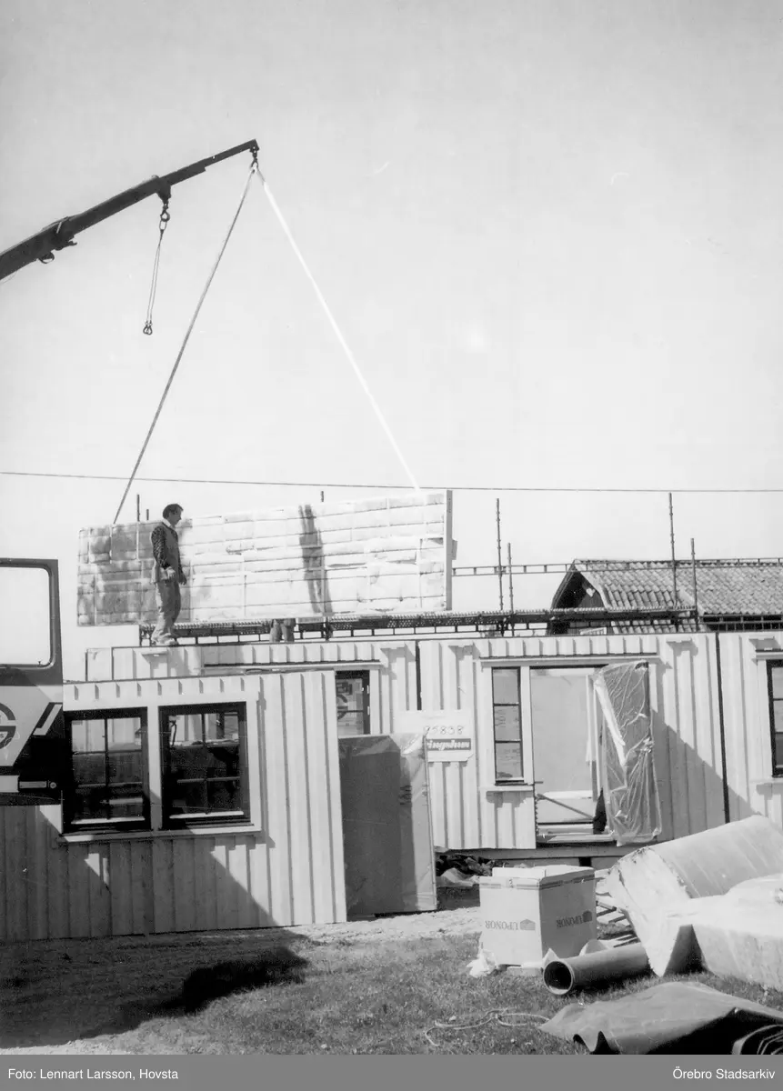 Man på tak i Förlunda i Hovsta tar emot byggdelar, 1986