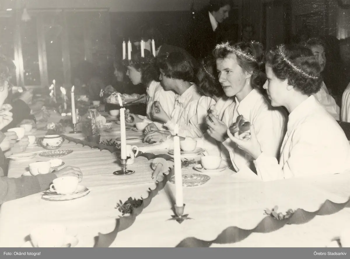 Lucia med tärnor på morgonfika på flickläroverket, 1954