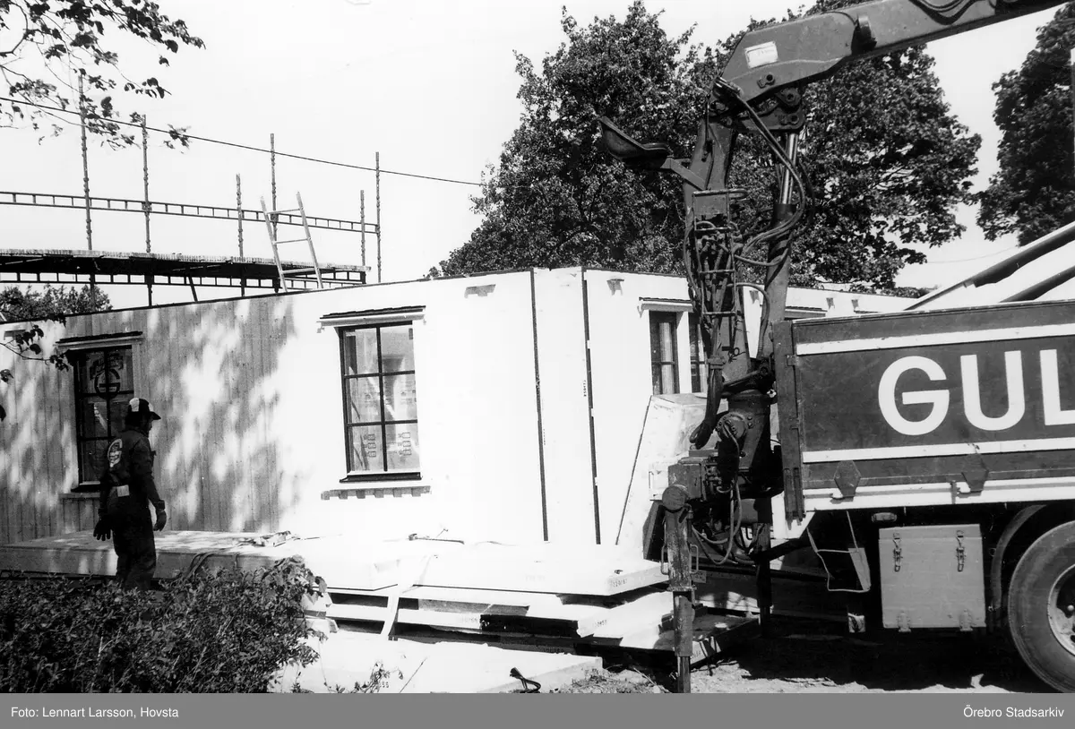 Lastbil placerar hus på gård i Förlunda i Hovsta, 1986