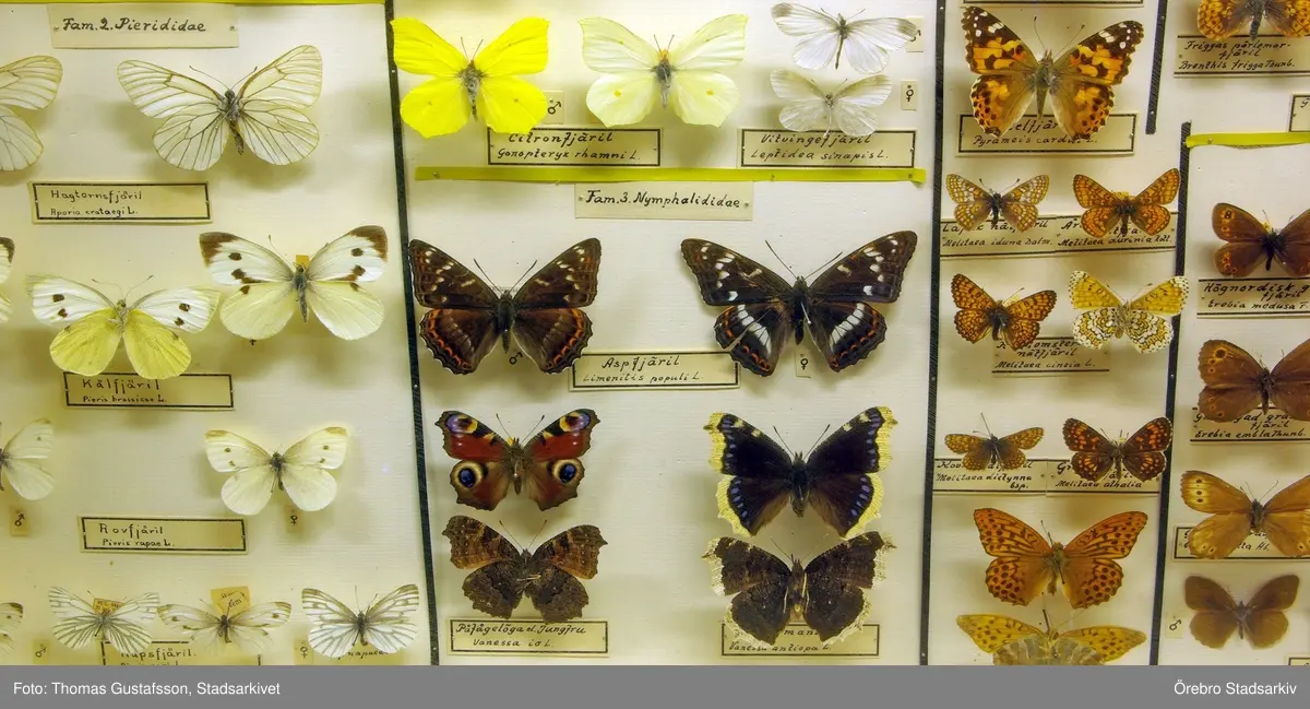 Fjärilar i monter på Biologiska museet, 2014-04-28