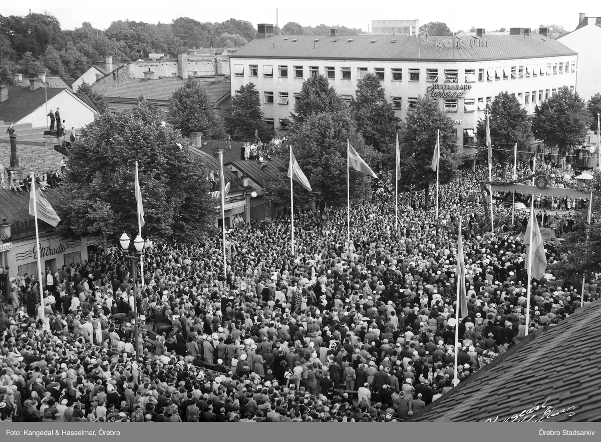 Folksamling på Stortorget vid besök av Gustav VI Adolf, 1953
