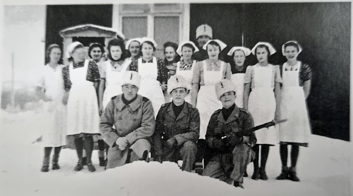 Gesäters skolhus. Skolkökselever, lärare och miltärer