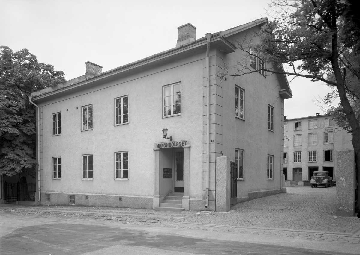 Bild från grossistföretaget Hakonbolagets fastighet år 1937 med adressen Södra Kyrkogatan 7 i Karlstad. Firman var en av grundarna till dagens ICA-koncern.