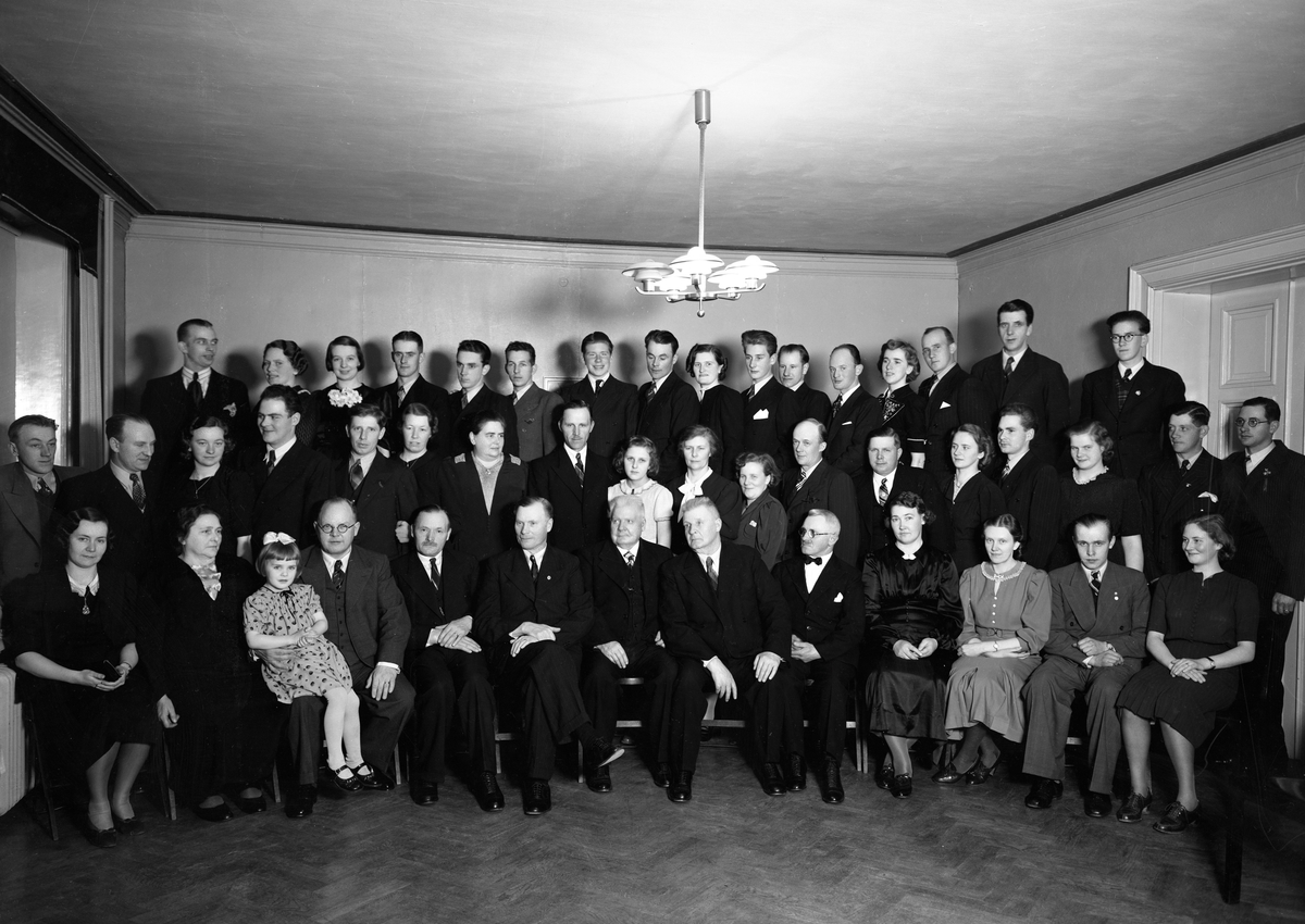 Okänd högtidlighet hos Frans Elinder AB år 1939. I främre raden som nummer 5 från vänster huvudpersonen själv med de båda kakelugnsmakarna, bröderna Samuelsson alldeles till höger. På bilden finns också Ragnar Nordqvist, Erik Lindbärg och Jarl Wallin med
