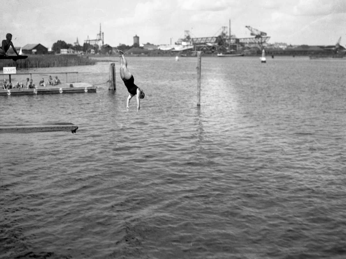 Titel: Bildserie från slutet av 1930-talet från Karlstads dåvarande simstadion. Anläggningen låg i anslutning till den s k badholmens östra sida söder om Kanikenäset. Badet invigdes 1923 och togs ur bruk och revs 1943 pga dålig vattenkvalité. En liknande konstruktion som ersatte den på bilderna byggdes upp i Örsholmstjärnet i början av 1950-talet.