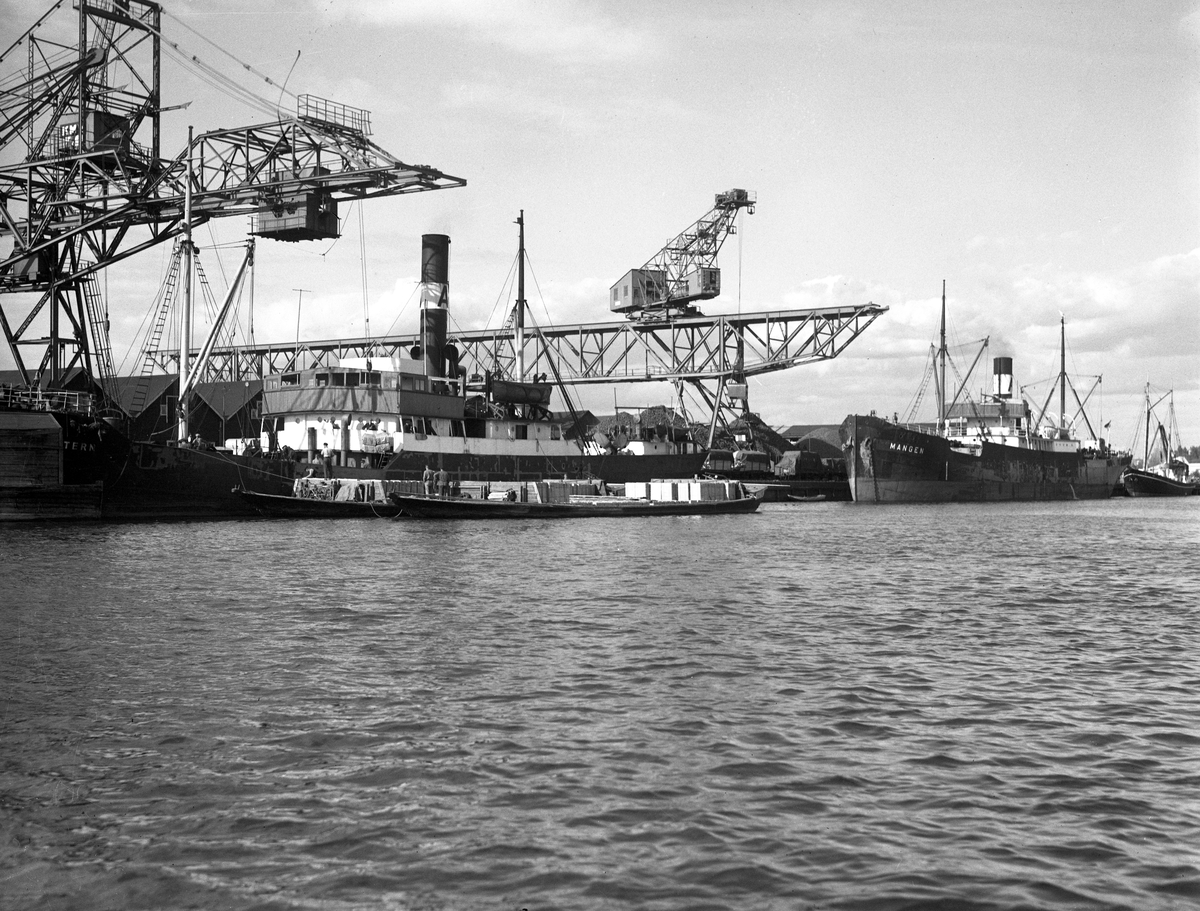 Ahlmarksfartygen Alstern och Mangen lastar i Yttre hamn i början av 1930-talet.
