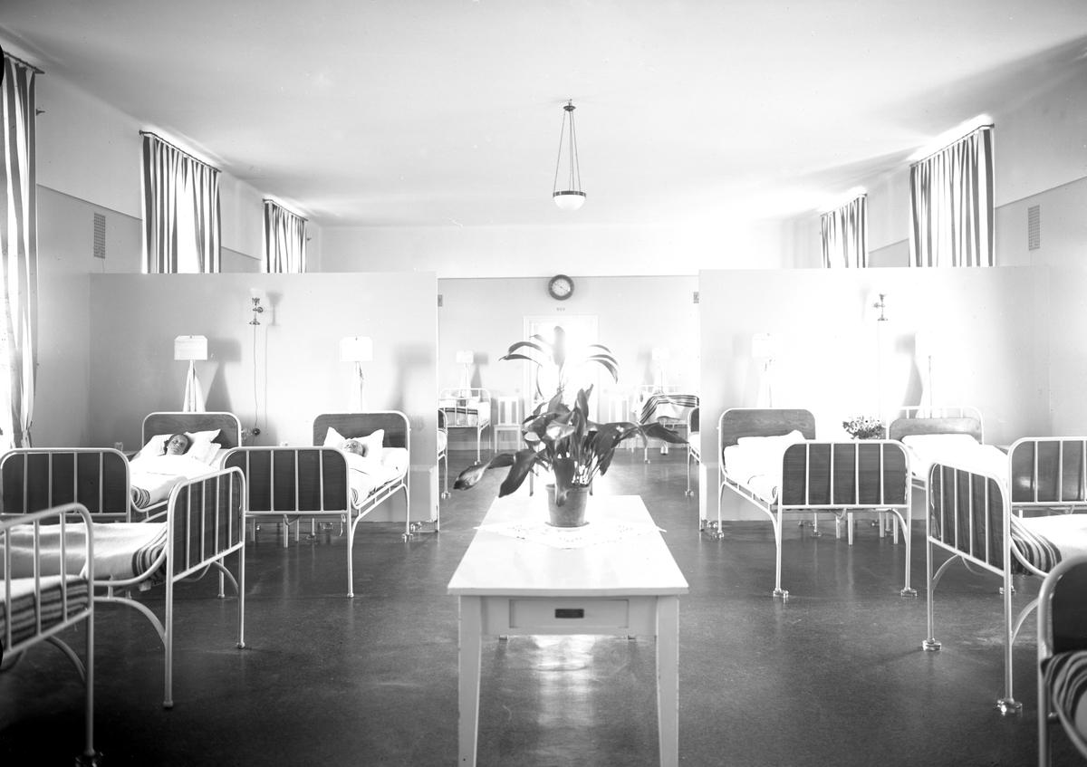 Bildsvit från länslasarettet med omgivningar tagen mellan 1905 och 1961. Sjuksal på 1920-talet.
