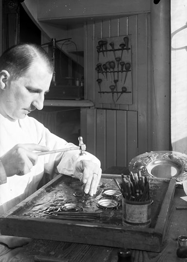 Guldsmed i arbete, drivning av silver, Köpmangatan 3 i Västerås.
