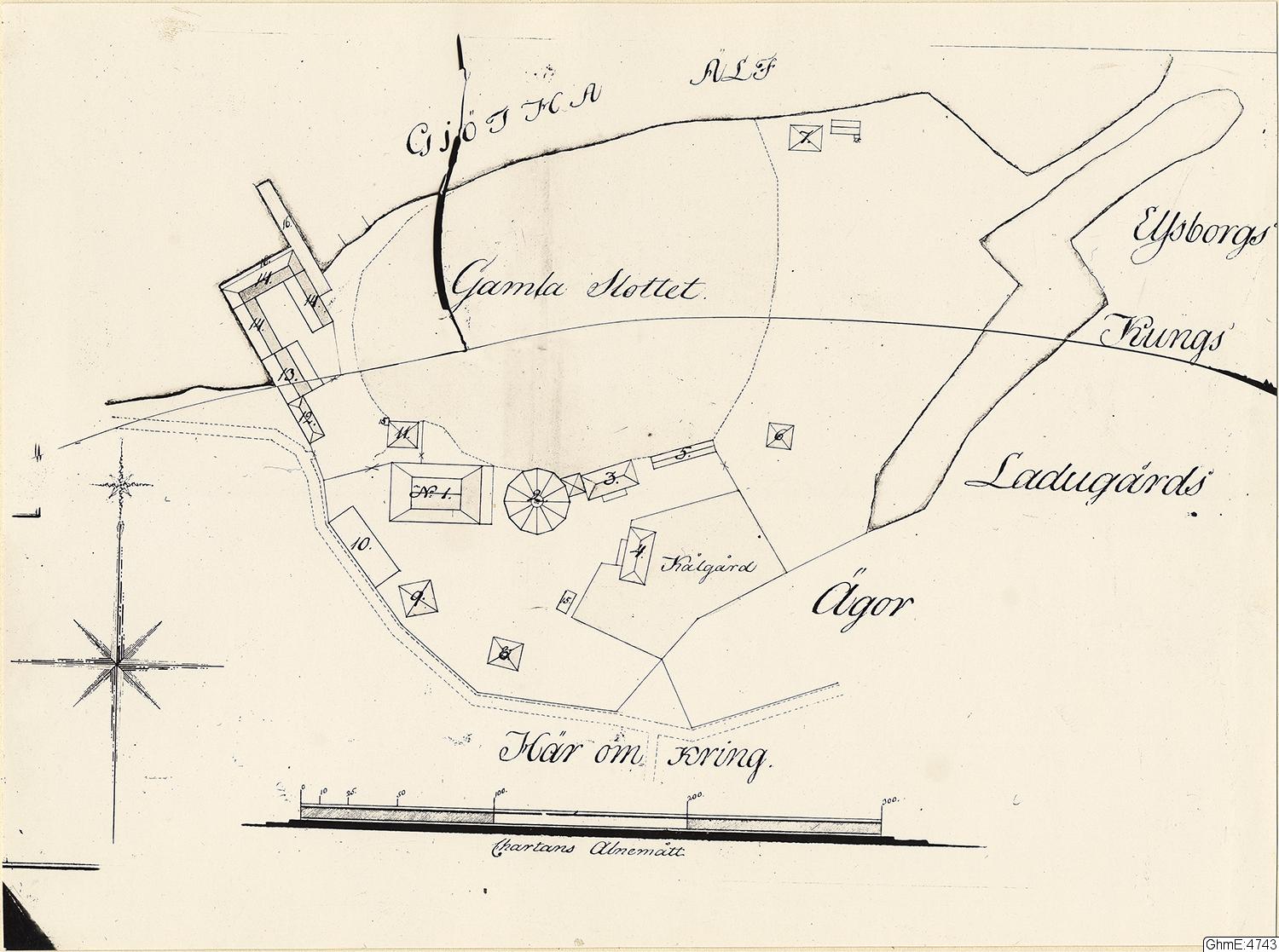 Klippanområdet med markering för Älvsborgs slott, Gamla Slottet med Elfsborgs Kungsladugårds Ägor. Karta med området för glasbruketr år 1797, Museets bild något renritad och svartvit. Orignalkartan i färg. se URL