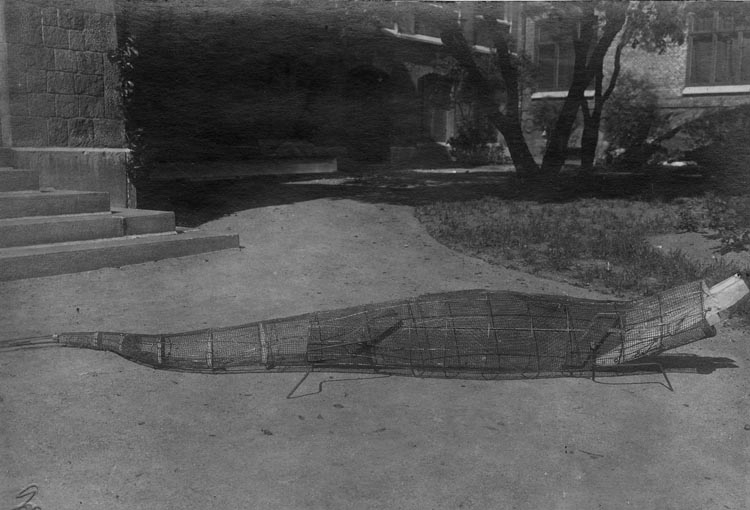 Text på baksidan av bilden: "1011 b. U.M. 7162. 6262. Fotografi nr. 2 över Kongokrokodilens montering av konservator Hilmer Skoog å Göteborgs musei gård juli 1918.
