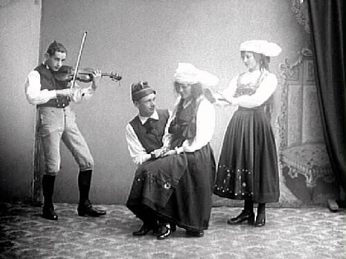 Folkdans. En fiolspelare, en kvinna som sitter i knät på en man och till höger om dem en kvinna som håller ut händerna mot axlarna på flickan i knät. (Samma fiolspelare på bilderna MR2_1699, 1735, 1938)