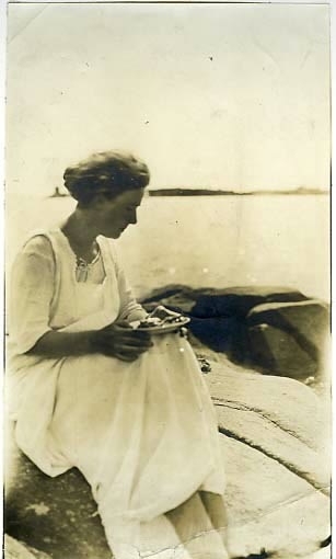 Kvinnoporträtt. Alice Bexell Schmiterlöw sitter och äter på en klippa vid havet i Varberg.