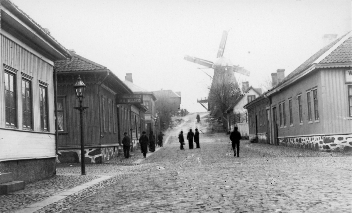 Huset närmast kameran till vänster ligger i kvarterat Krögaren utmed Drottninggatan. Gatan som korsar är Prästgatan och därefter ligger kv Guldsmeden, där skylten gör reklam för just en guldsmed. Till höger i bild ligger kv Bagaren. Längs bort ses Agrells väderkvarn på höjden i Pilhagen. Fototid 1910-tal.