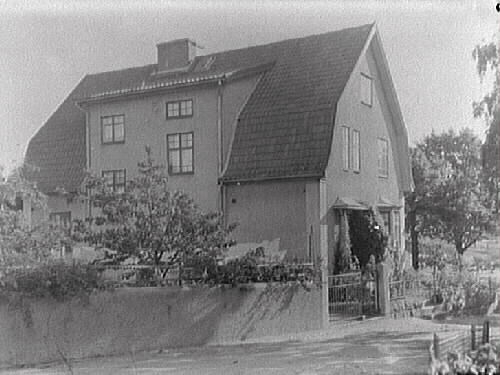 Exteriör av den s k Frechmannska villan i kv Tunnbindaren, i hörnet av Kvarngränd (närmast kameran) och Kyrkogårdsvägen. Bilden tagen mot öster. Huset byggdes med tre lägenheter ca 1928 av Christian August Frechmann. Fönstersättningen följer asymmetriskt husets planlösning på Arts'n Crafts-manér och nedre takfallet är svagt konkavt, modernt vid tiden, och bryts på långsidan av en hög frontespis som nästan når taknocken. På gaveln finns en altan och intill den grindpartiet in till tomten, som hitåt i bild hägnas av en putsad mur.