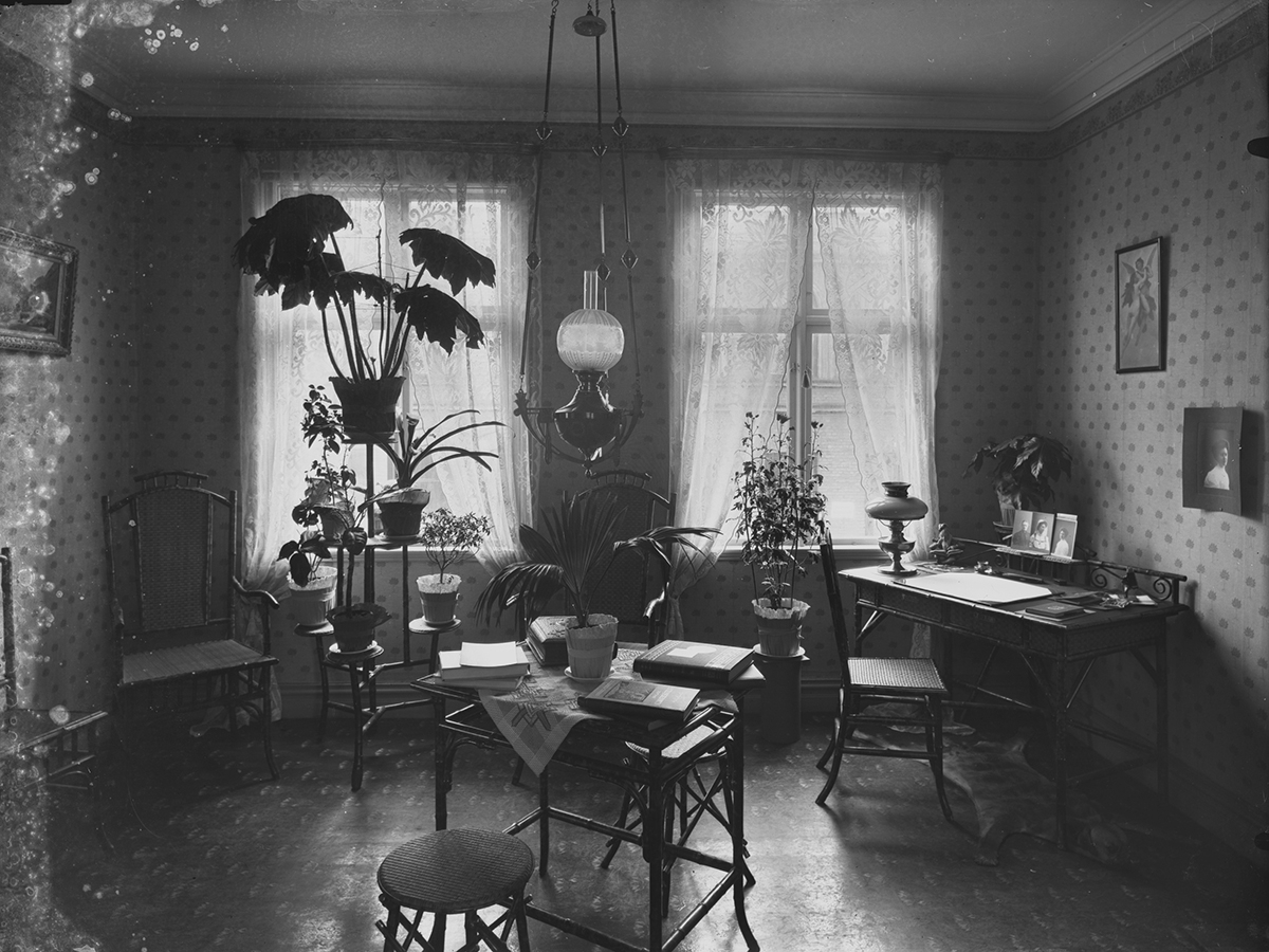Interiör från salong i bostad. Fotograf Gustaf Björkströms bostad i samma hus som fotoateljén, kv Apotekaren, Varberg, 1906-1914 samt 1920-1933. Jämfört med foto GB1_1101 av samma rum så ter sig detta vara taget tidigare, kanske så snart Gustaf hade flyttat in år 1906. Möblemanget är betydligt enklare och genomgående tillverkat av bambu/rotting. Denna tropiska möbelstil var populär vid sekelskiftet 1900. Flera foton av Elin på skrivbordet och väggen. Piedestalen och fällen under skrivbordet är det enda som finns kvar på den senare bilden.