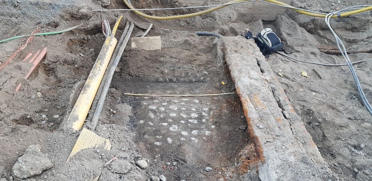 Framrensad kullerstensyta i undersökt schakt. Från arkeologisk undersökning i form schaktningsövervakning vid Stadsbiblioteket, Gävle stad och kommun. L1951:5633.