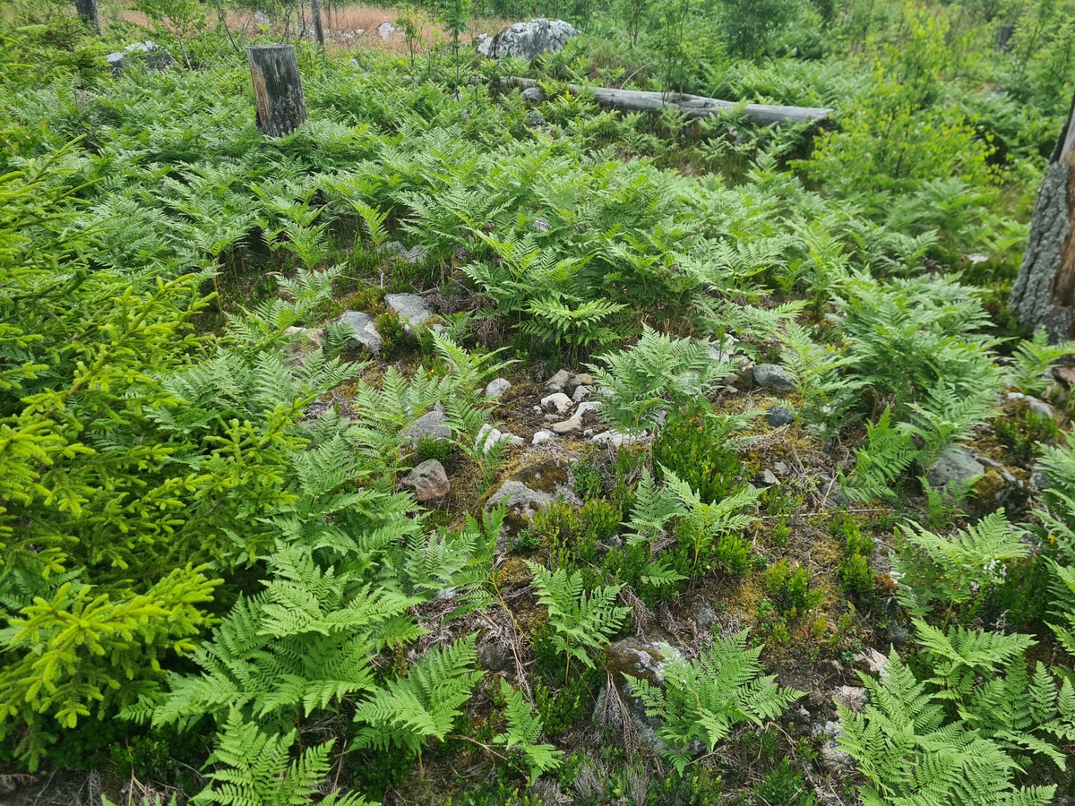 Ett av röjningsrösena inom röjningsröseområdet L2023:398, fotat mot öster. Från arkeologisk förundersökning i Norra Åbyggeby i Hille socken, Gävle kommun. L1948:7210, L1951:3532, L2023:398, L2023:400 & L2023:401.