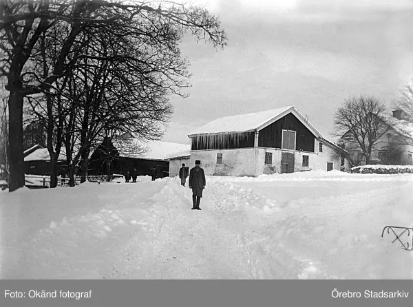 Män i spårsnö framför lada i Ramsberg, 1920-tal