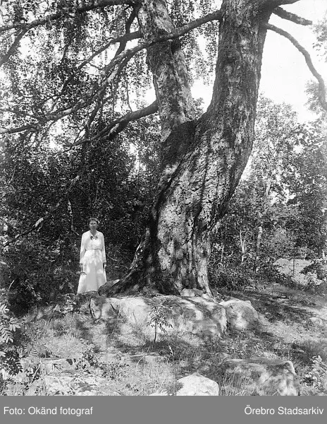 Kvinna vid stora björken i Vrethammar i Ramsberg, 1920-tal