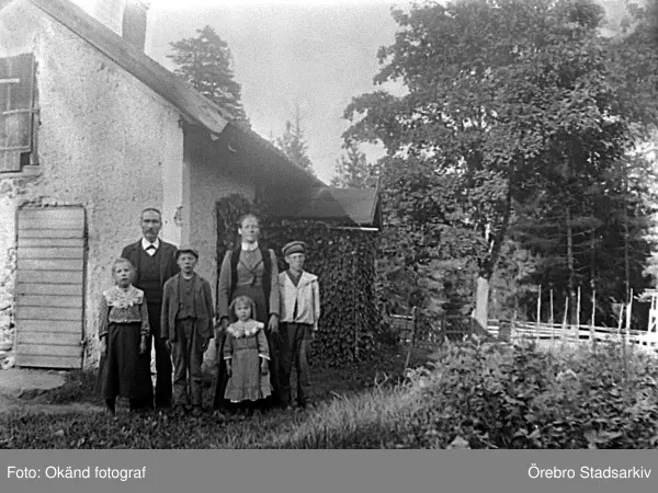 Familj framför hus i Ramsberg, 1920-tal