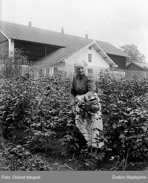Kvinna plockar hallon i Ramsberg, 1920-tal