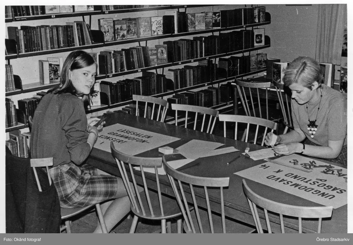 Skyltmålning på ungdomsavdelningen på Örebro Stadsbibliotek på Fabriksgatan, 1969