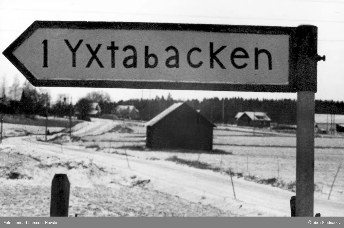 Vägskylt pekar mot Yxtabacken i Hovsta 1975