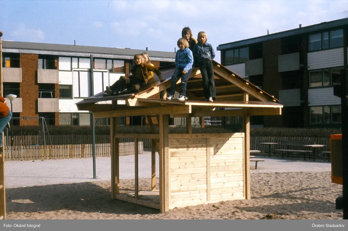 Barn på taket till hus på lekplats i Varberga, 1970-tal