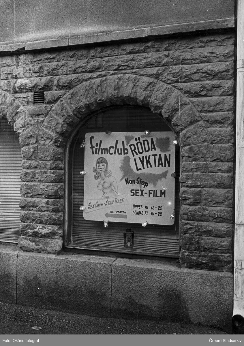 Reklamskylt för filmklubben Röda Lyktan på fönster på Ringgatan 9, 1970-tal