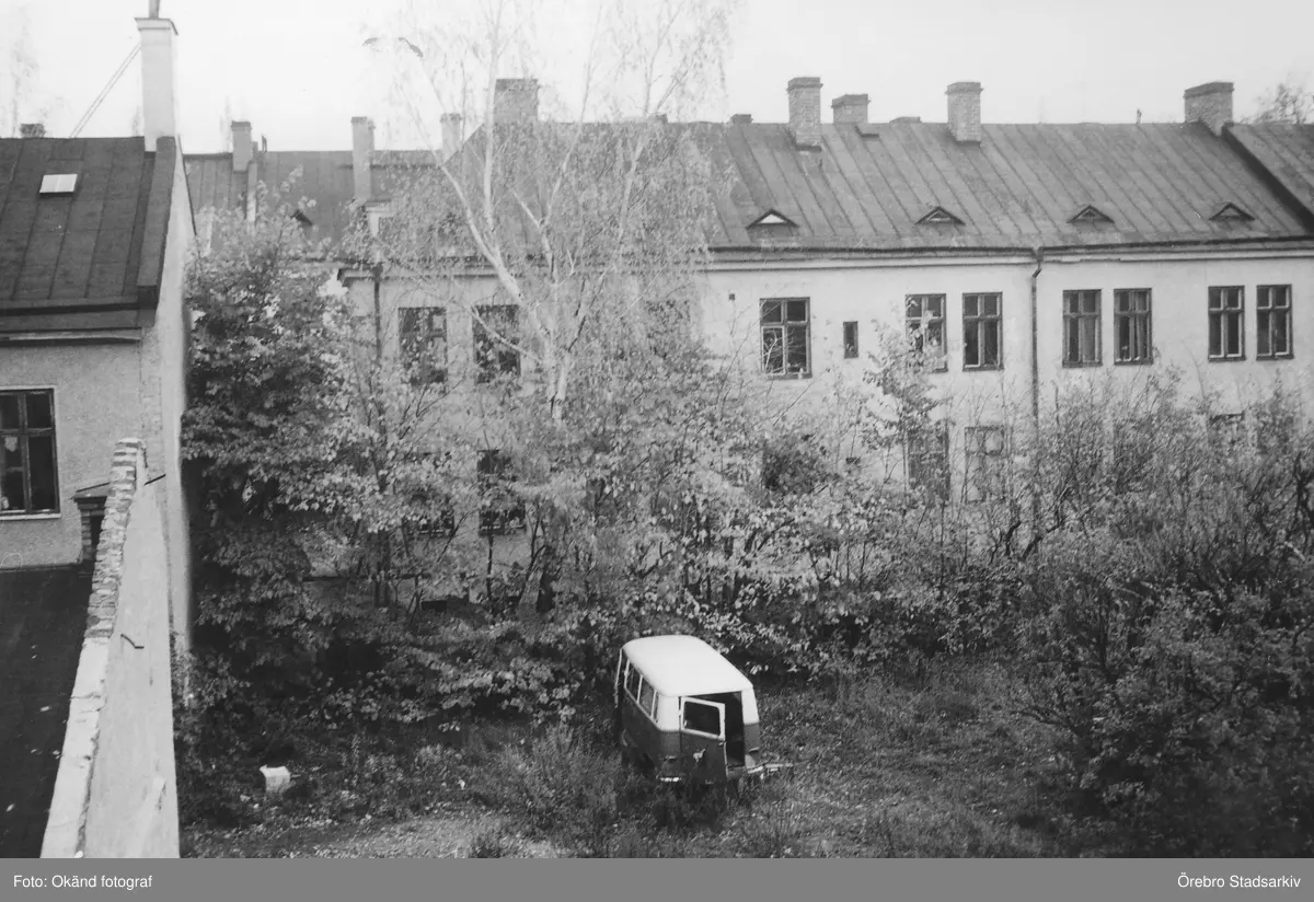 WV-buss parkerad på övervuxen gård till hyreshus på Oskarsvägen 7, 1970-tal