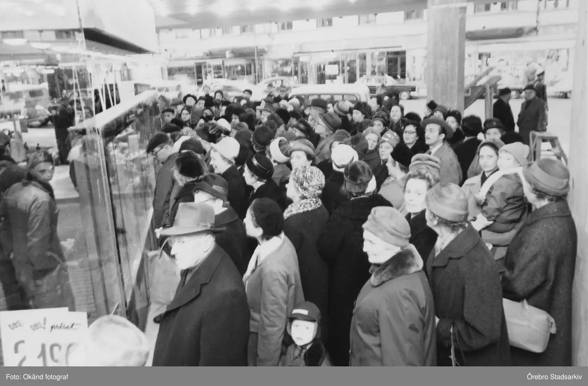 Trängsel utomhus vid invigning av varuhuset Krämaren, 1963-03-25