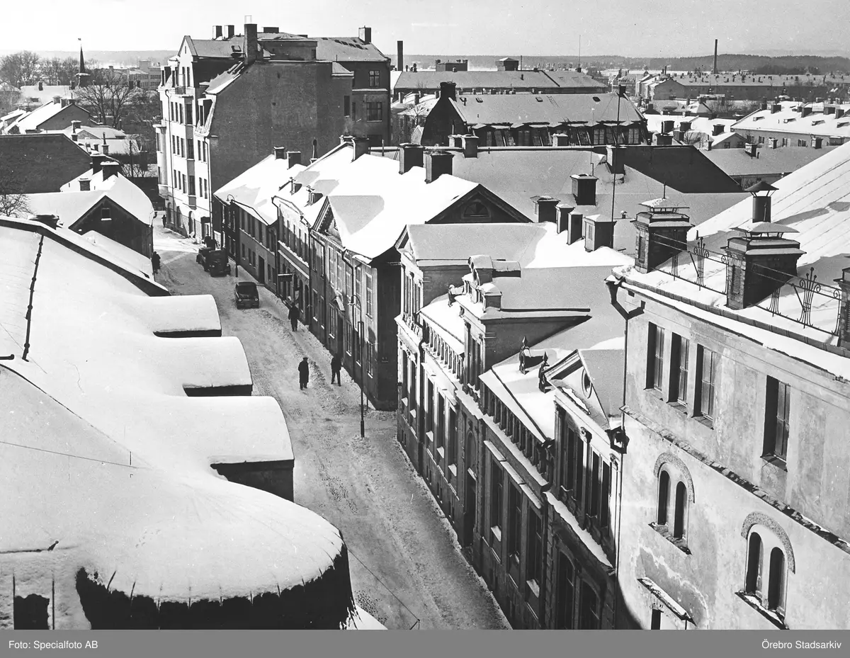 Vy över hustak med snö på Kyrkogårdsgatan mot söder, 1960-TAL