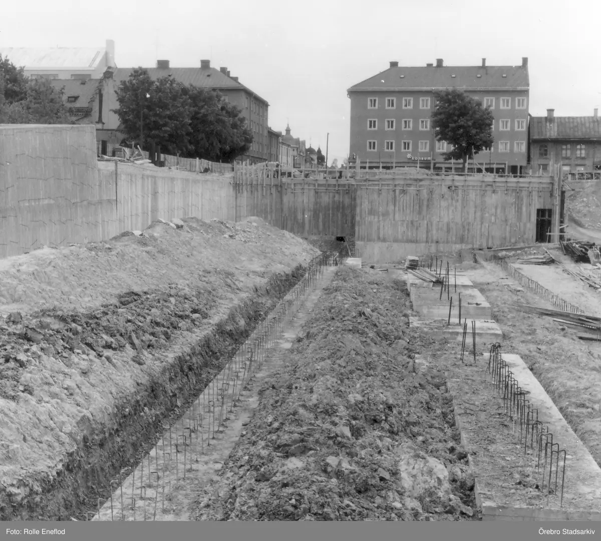 Grundläggning i hus B vid nybyggnation i kvarteret Tunnbindaren, 1959