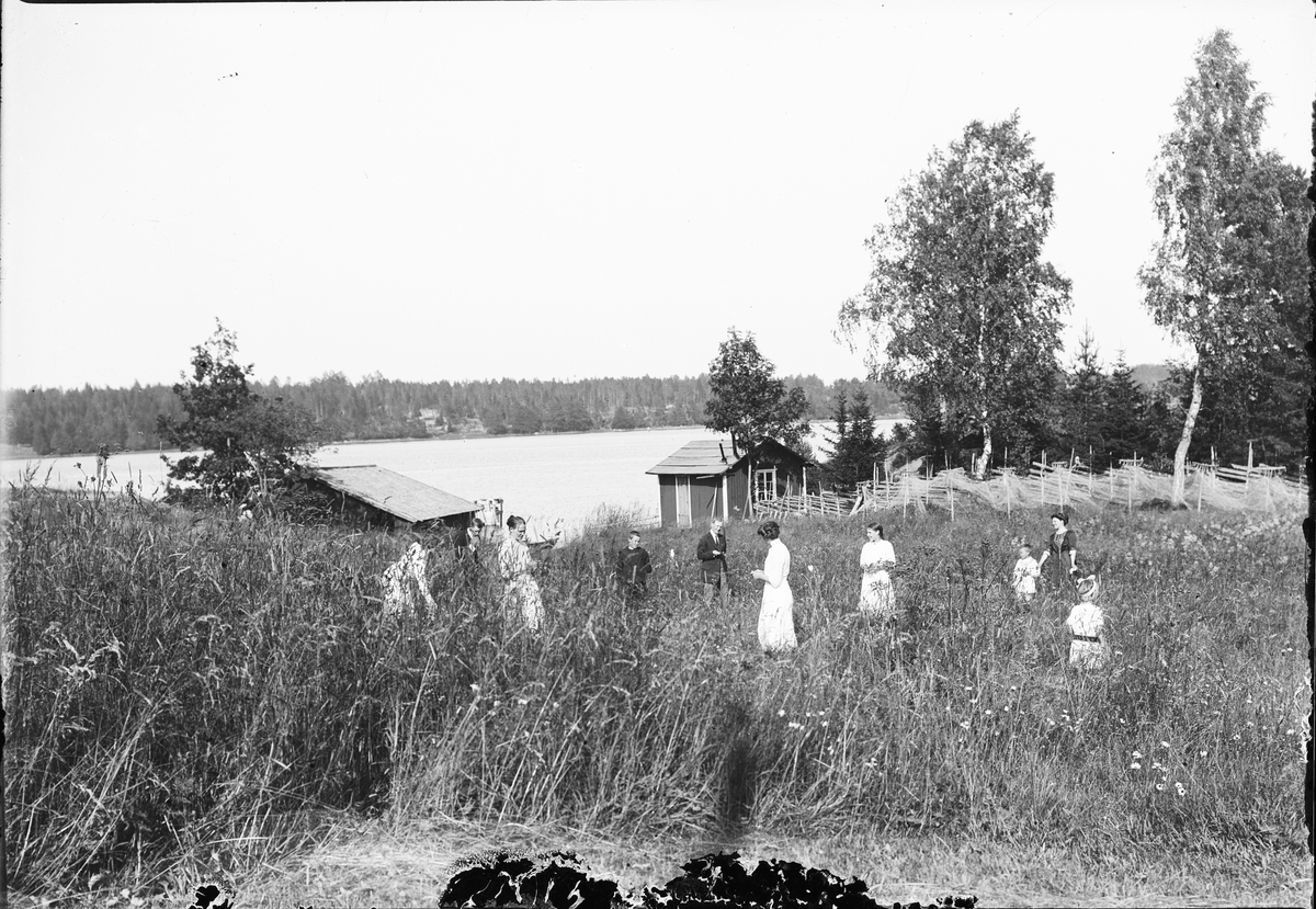 Titel: Barn och vuxna ute på äng, Östhammar, Uppland