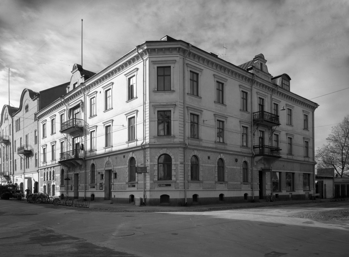 Fastighet byggd 1900 för Färjestadsbryggeriets räkning. I hörnet har följande näringsställen haft lokaler i oavbruten följd: Stadskällaren, Gillet, Örnen samt dagens Alfie. Bilden från 1944.