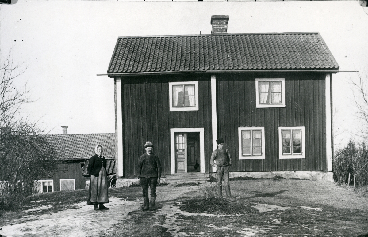 Klara, Per-Erik och Eskil Pettersson framför bostaden, 1917.