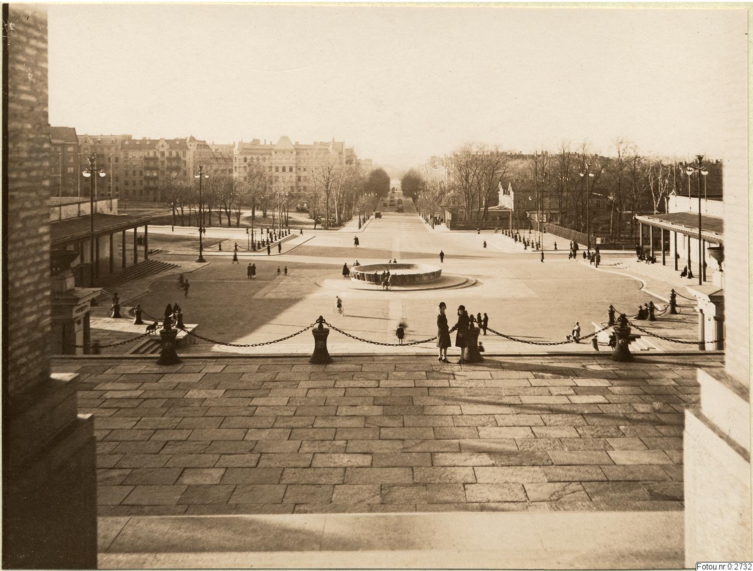 Utblick över Götaplatsen och Kungsportsavenyen från Konstmuseets trappa, innan Milles Poseidon-staty kom på plats.