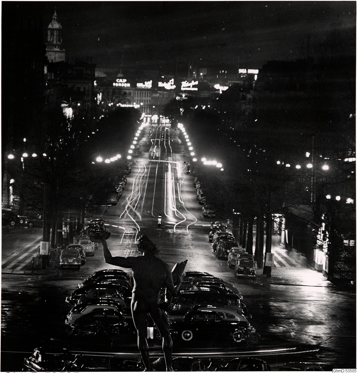 Fotot taget från Göteborgs konstmuseum mot norr längs Kungsportsavenyn en kväll i november. I fonden syns Domkyrkotornet