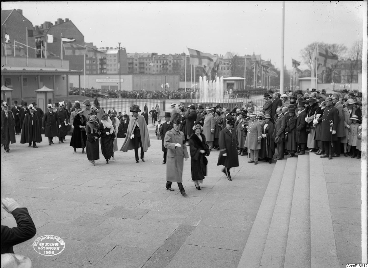 Jubileumsutställningen 1923. Högtidligheter, händelser: Öppningshögtidligheterna den 8 maj. De kungligas ankomst till utställningen.