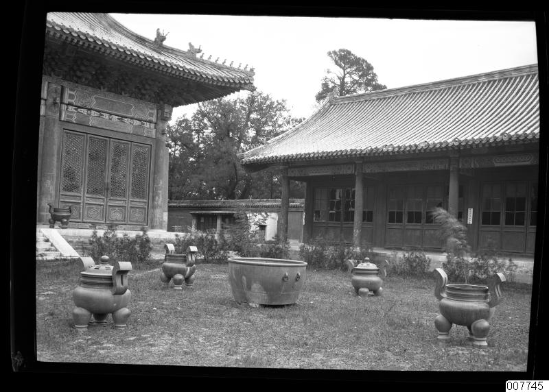Två byggnader i vinkel. På gräsplanen framför står en urna och fyra tripoder.