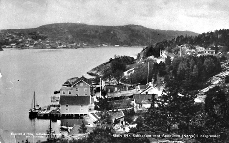 Tryckt på kortet: "Motiv från Saltbacken med Sponviken (Norge) i bakgrunden".