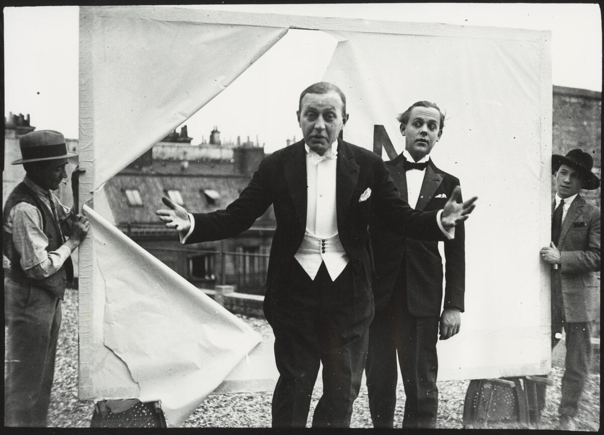 Rolf de Maré, Jean Börlin och två oidentifierade personer under inspelningen av filmen "Entr'acte" (1924).