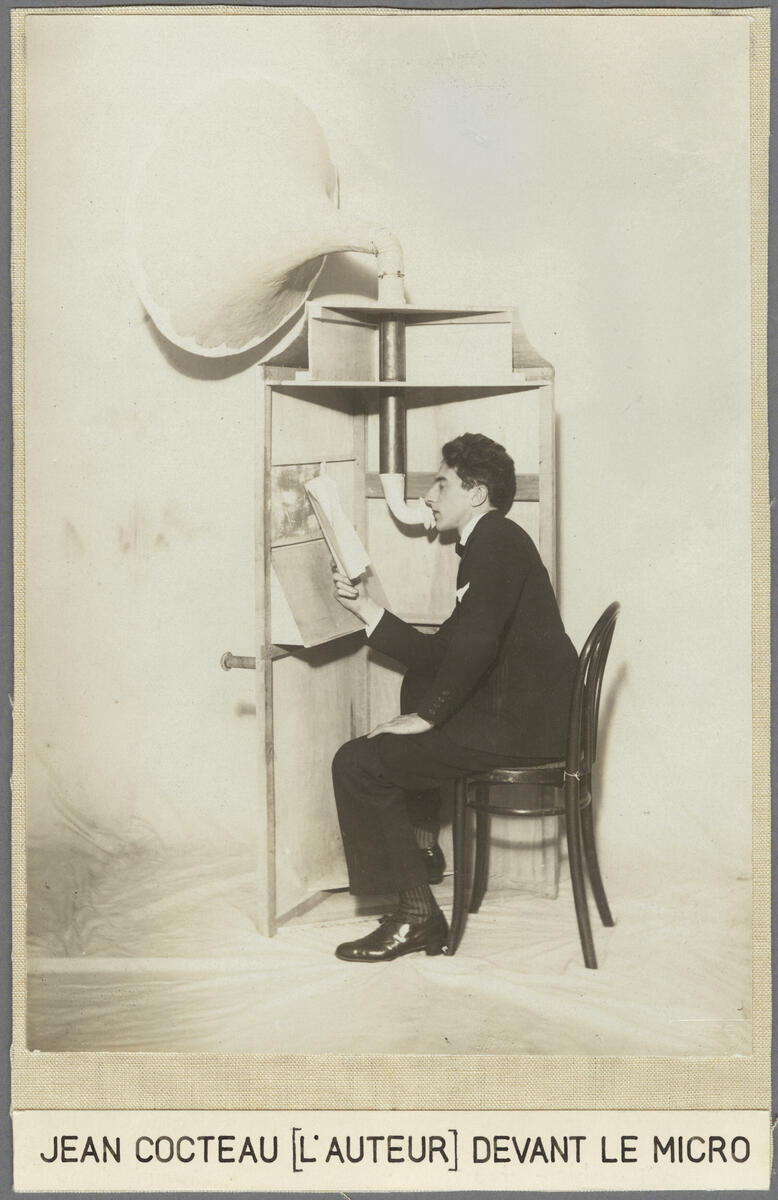 Jean Cocteau vid en av fonograferna från uppsättningen "Bröllopet på Eiffeltornet".