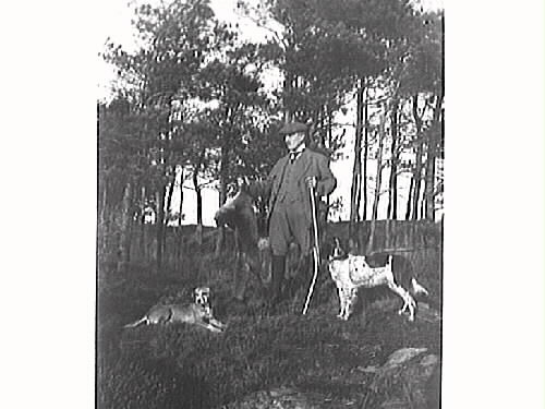 En jägare med keps och bössa står i skogen med två hundar och håller upp en död räv. (Se även bild MR2_1598)
