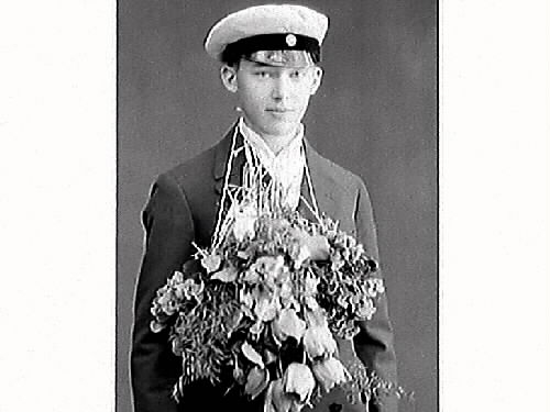 Examensporträtt av en yngling i studentmössa, Vidar Antonsson, Varberg. Vidar har blomsterbuketter hängande kring halsen och mössa med blank skärm.