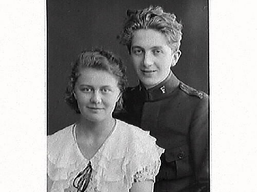 Ung Brita Andersson, Varberg, i klänning med skira volanger och en ung man klädd i frälsningsarméns uniform. Adress till beställaren är fru Knutsson.