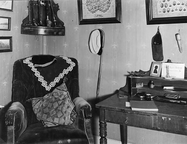 Arbetsrum i Fågelboet med skrivbord och fåtölj. På väggen hänger en käpp, studentmössa, tavlor och i hörnet sitter en hylla med pipor.