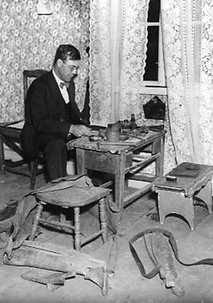 Håkan Bondeson sitter vid bordet med verktyg i Skomakeribostaden på Fågelboet. Kring bordet finns pallar, skinn och andra föremål.